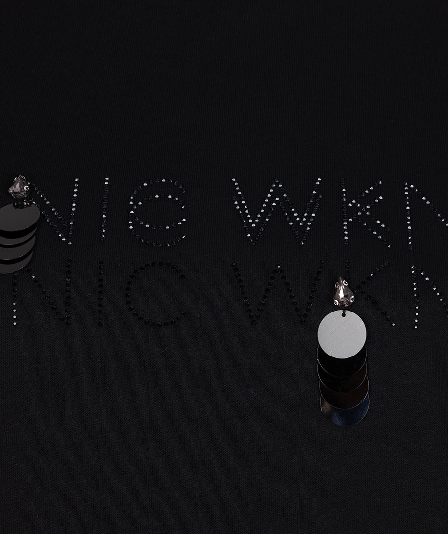Comfy trui met strass steentjes en speelsgeplaatste pailletten. De trui is gemaakt van 86% katoen en 14% polyester.