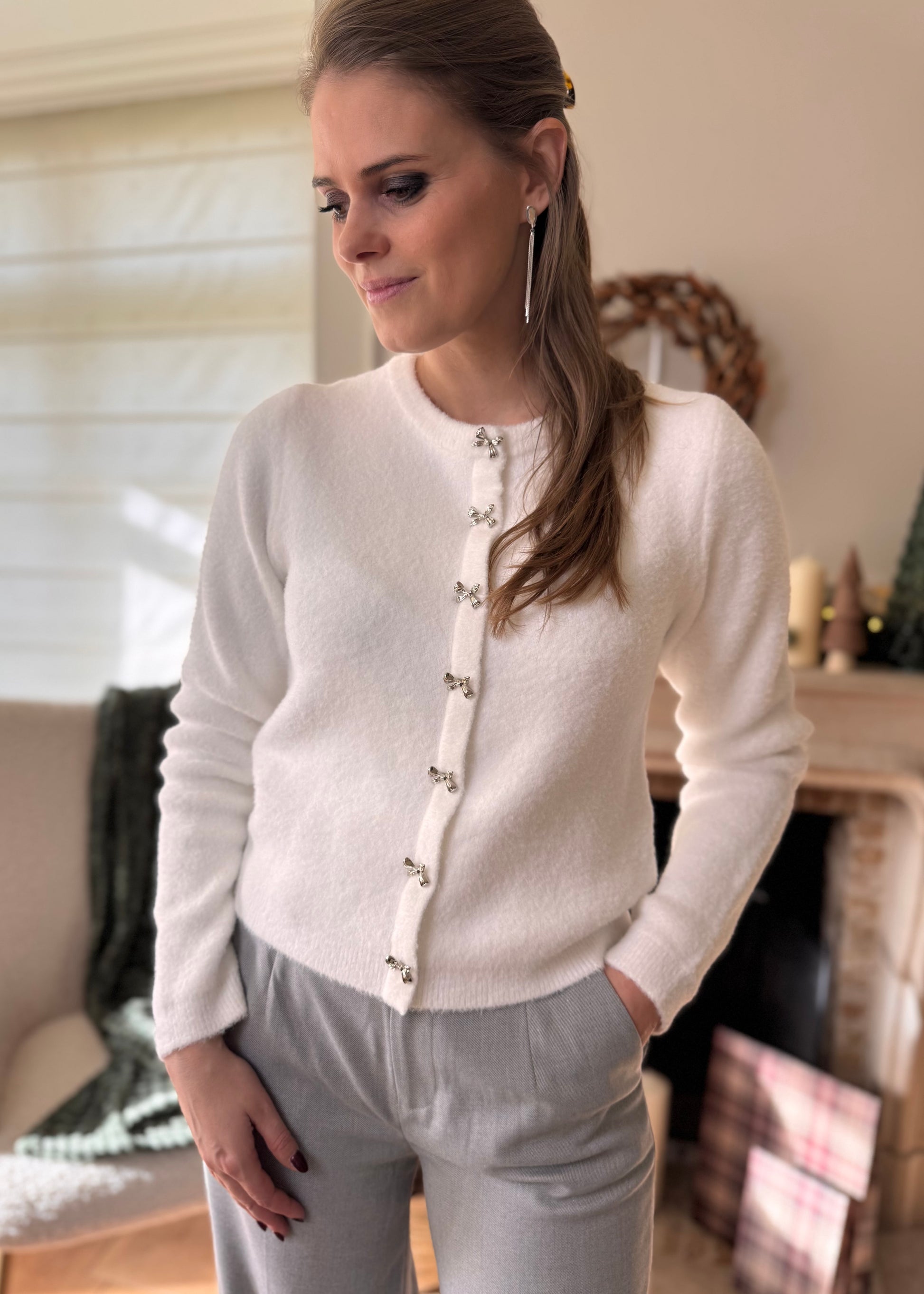 In deze Cardigan wil je gewoon dag en nacht leven :) Het giletje heeft een ronde halslijn en lange mouwen en voelt bovendien suuuperzacht aan! Het giletje is afgewerkt met schattige strikjes. Je kan deze gilet zowel bloot (met eventueel een topje onder) als boven een mooi bloesje dragen.