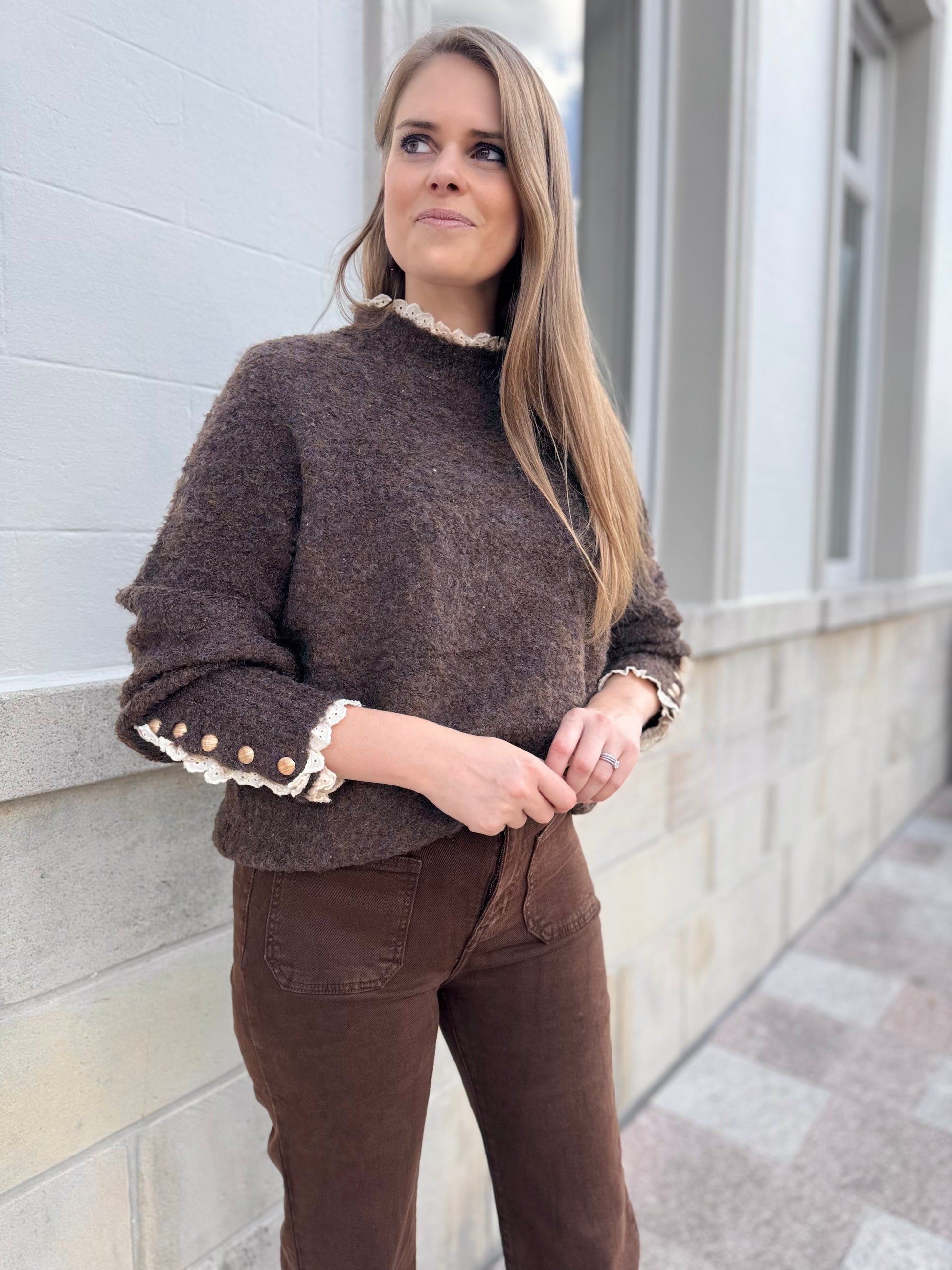Bouclé trui met kant - bruin