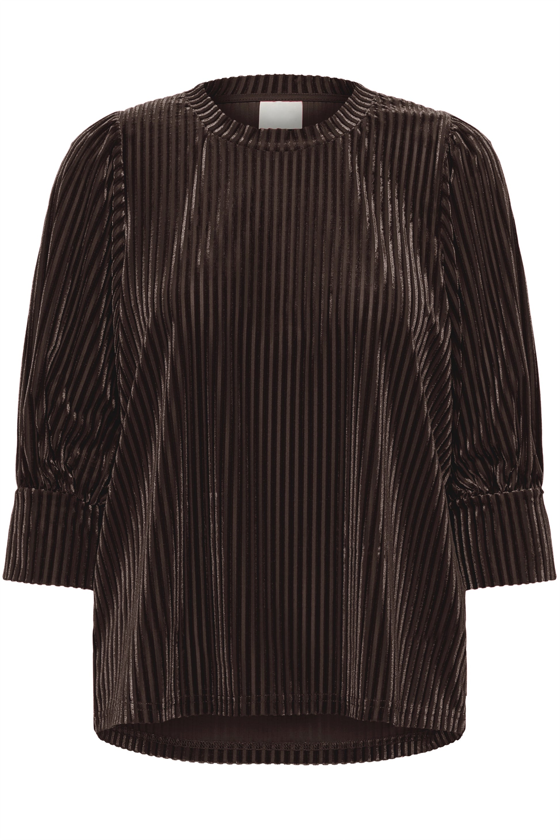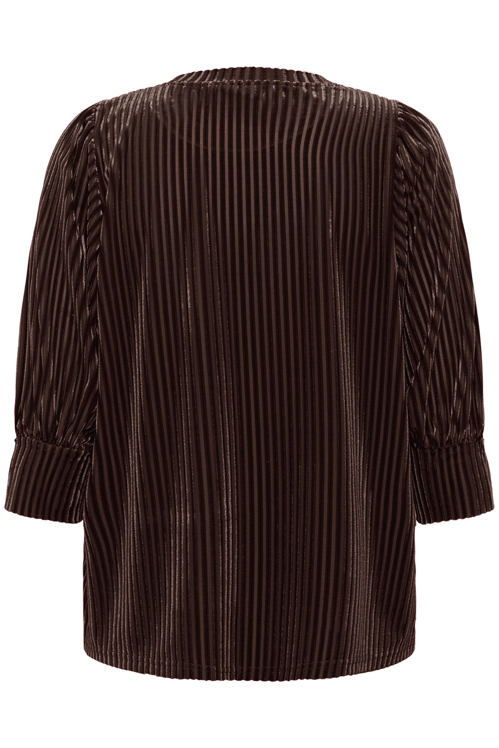 Gestreepte fluwelen blouse met een recht silhouet, ronde hals, zacht geplooide driekwartmouwen en brede manchetten. Subtiele textuur en een relaxte, verzorgde look.