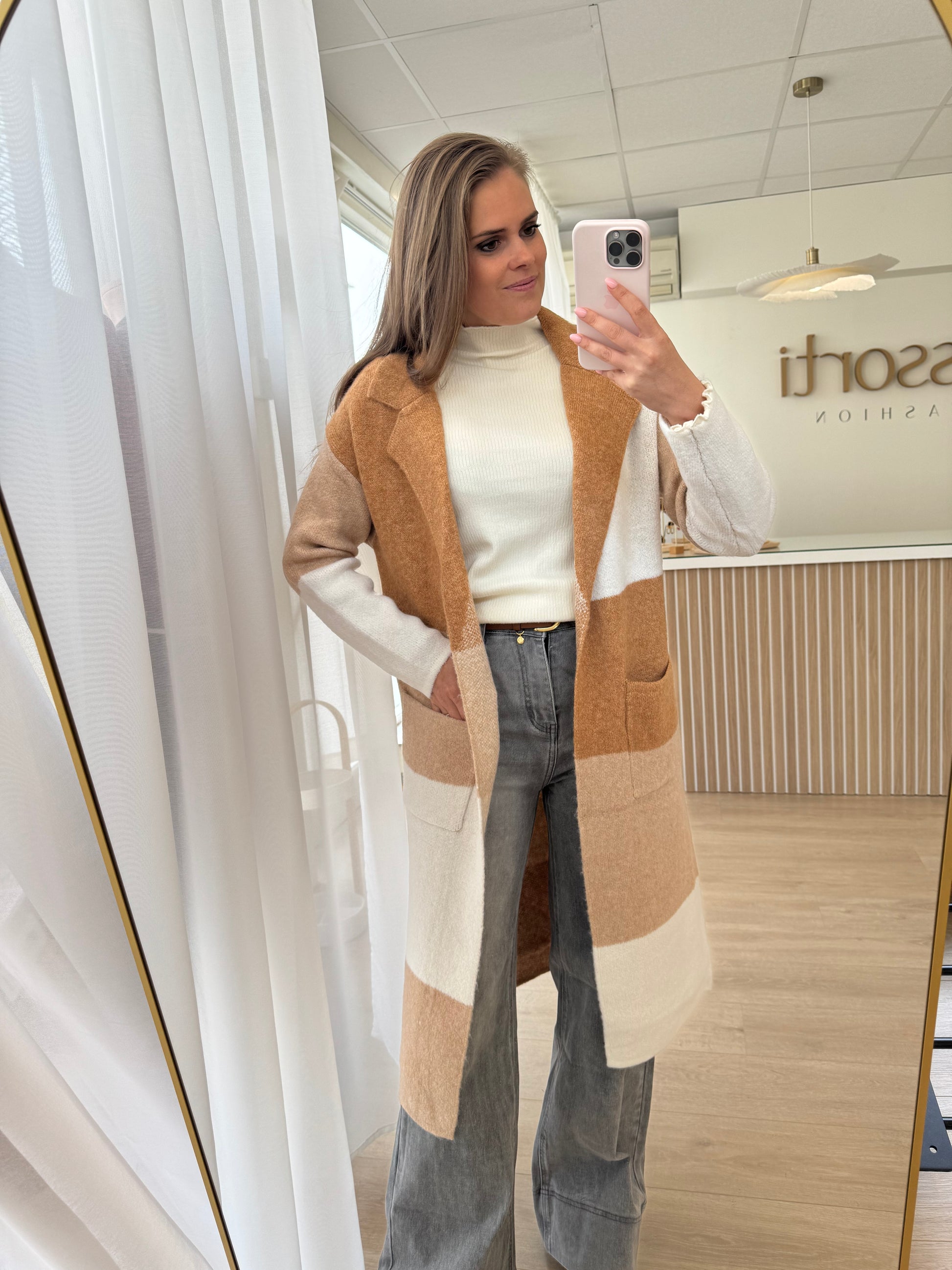 Gebreid warm vest met speelse blokken print. Dit lange vest heeft steekzakken, een reverskraag en is de ideale stijlvolle toevoeging aan je look als het net wat fris is.