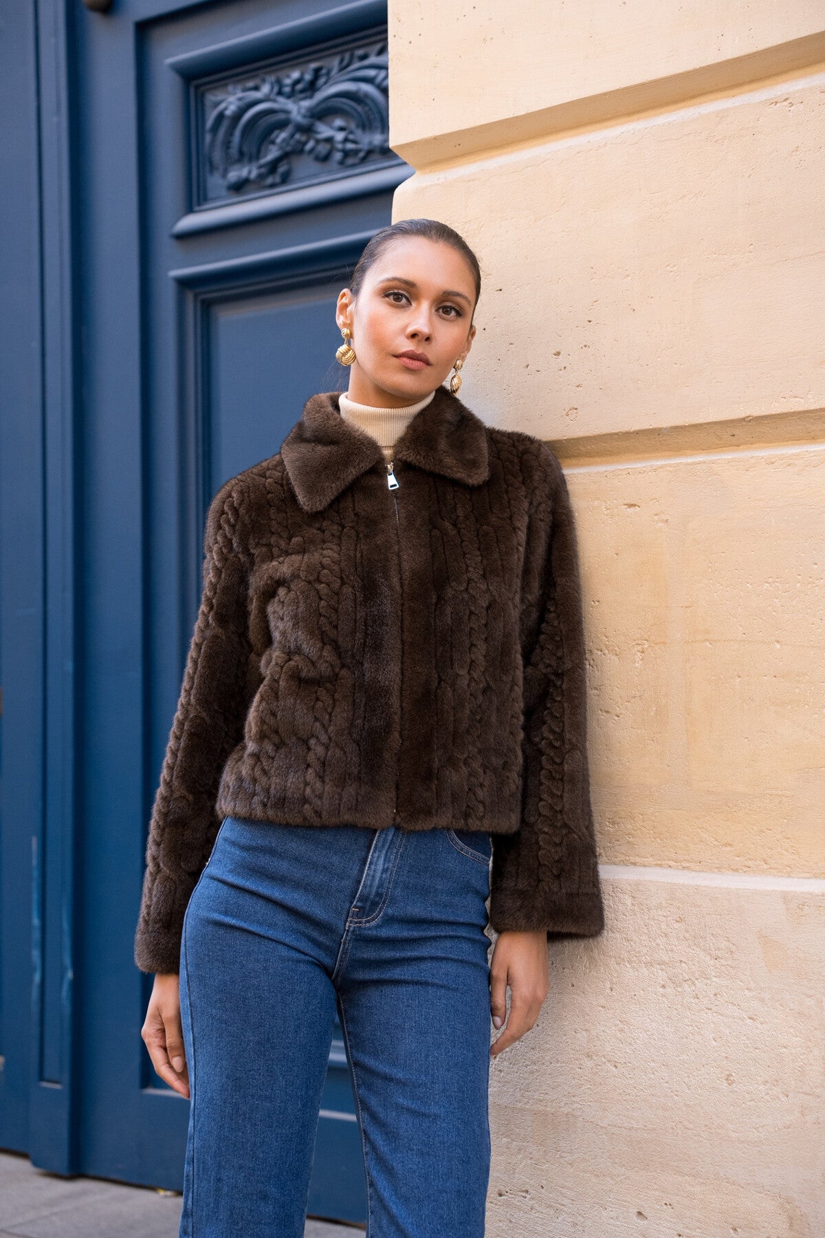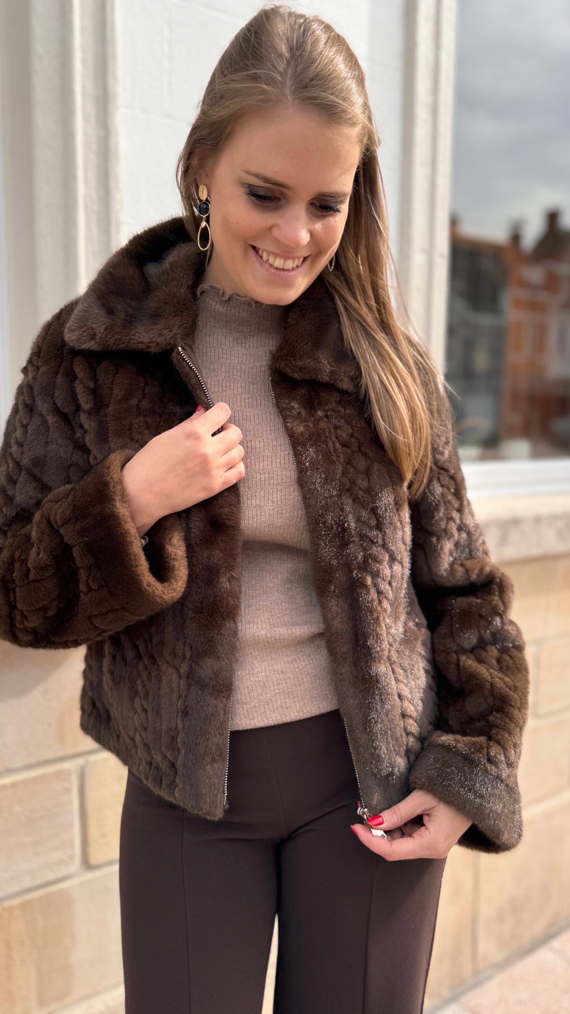 Verfijnd manteltje in superzacht bruin materiaal, afgewerkt met een fijne kabelstructuur. De kortere lengte geeft dit stuk een vrouwelijke en stijlvolle uitstraling.