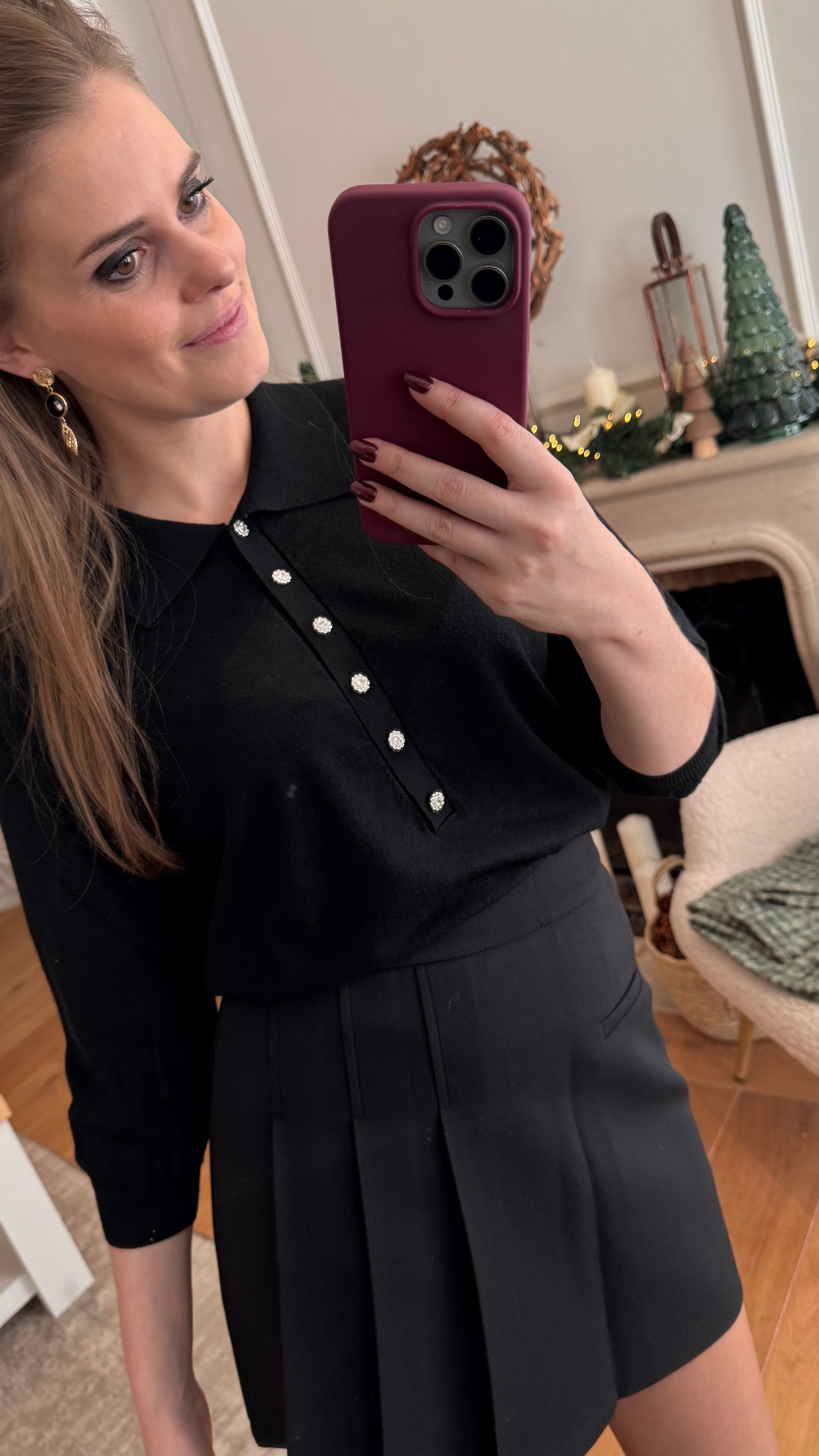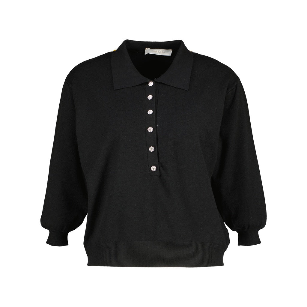 Dit truitje heeft een klassieke col revers die is afgewerkt met prachtige strass knoopjes. Het truitje heeft 3/4e mouwen en heeft een korte fit.