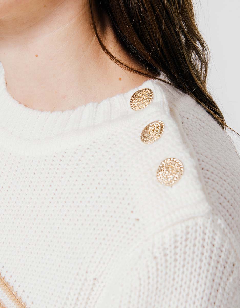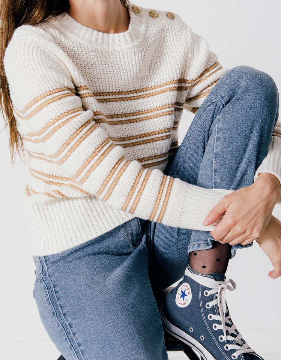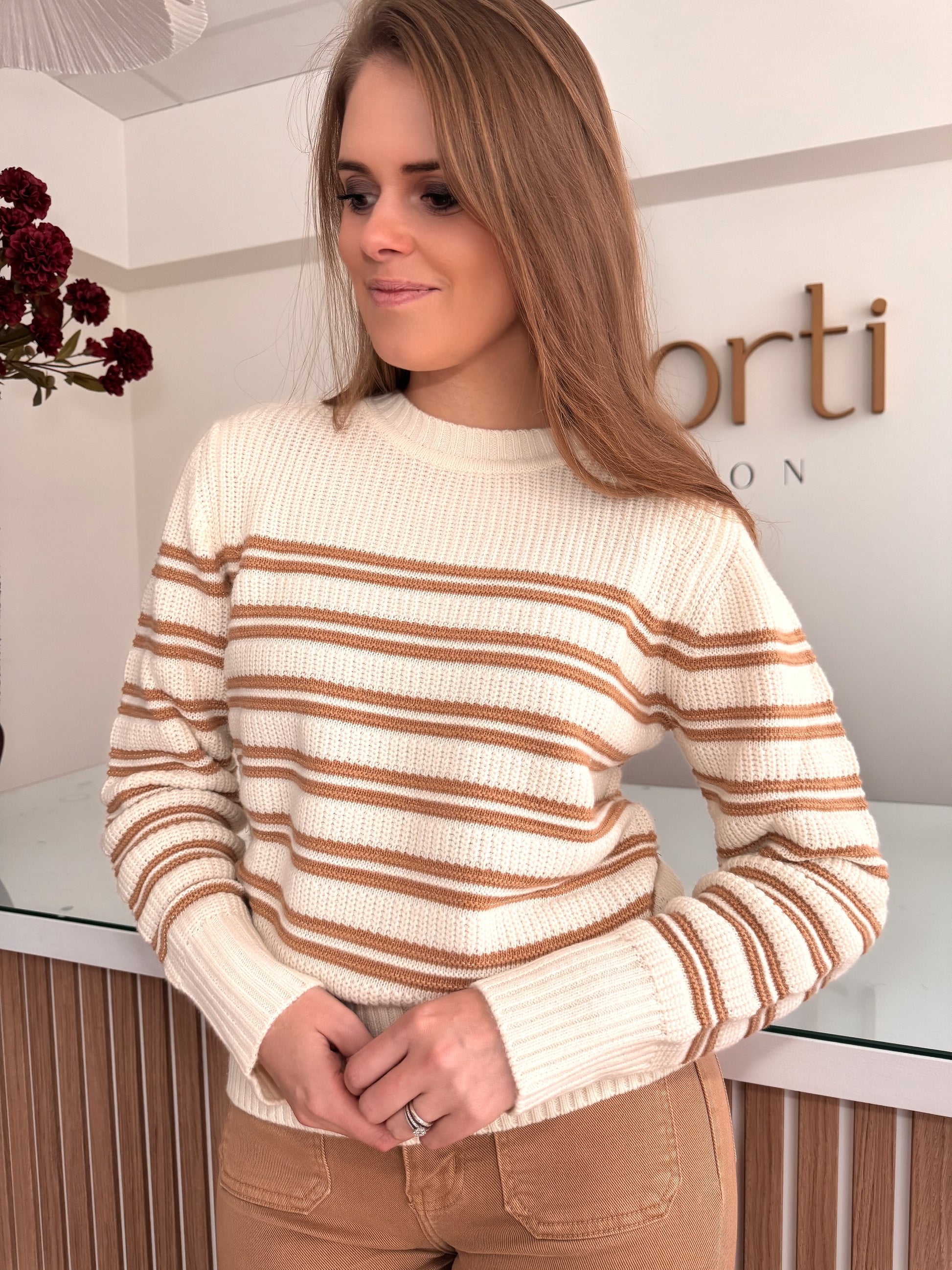 Deze zachte gebreide trui is een echte must-have voor het tussenseizoen. De warme camel- en ecrutinten geven hem een tijdloze en stijlvolle uitstraling. De trui heeft een ronde halslijn en is afgewerkt met goudkleurige knopen op de schouder.