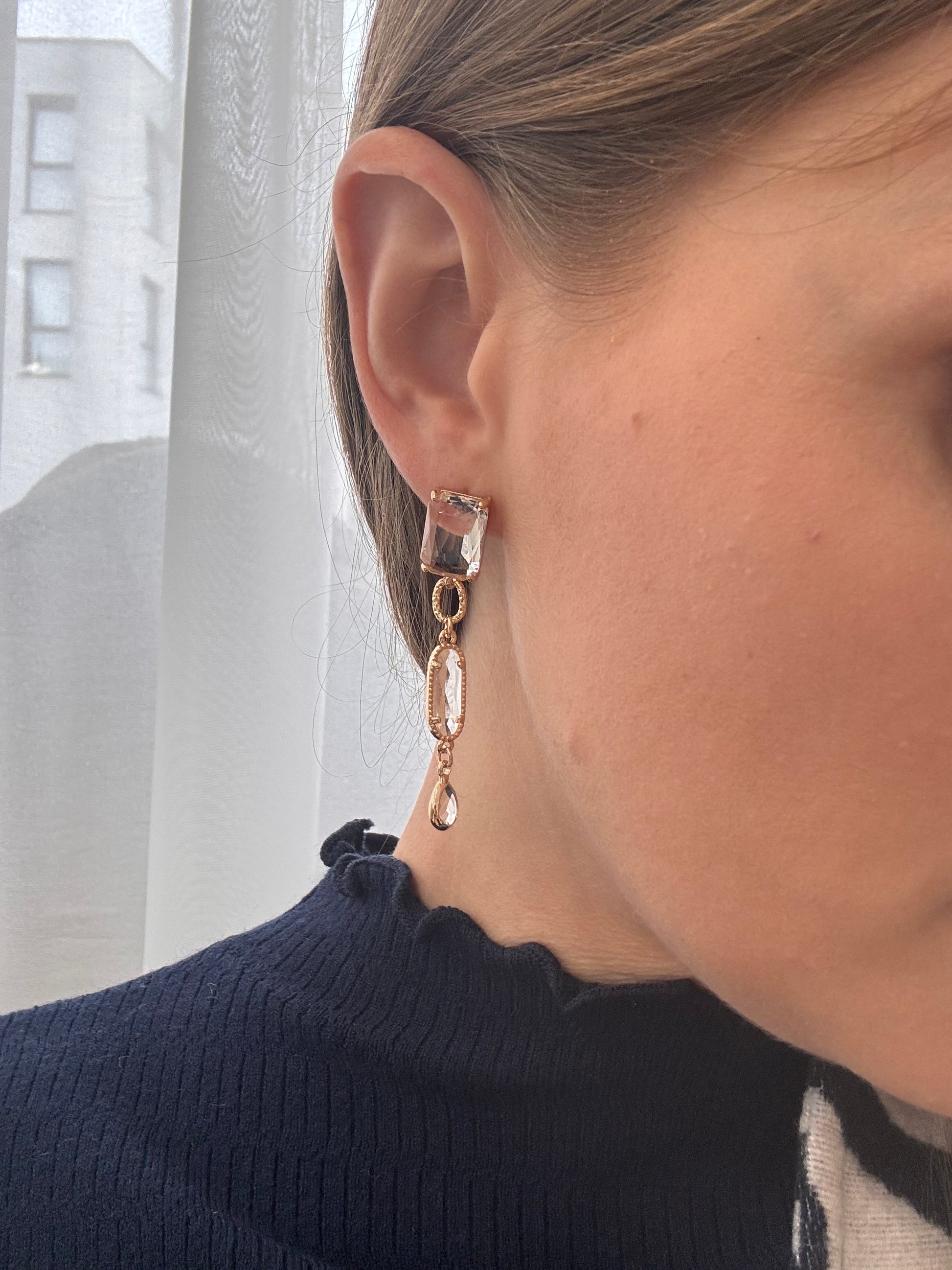 Elegante oorbellen met een sprankelende rechthoekige steen en subtiele druppelvormige hanger. De gouden afwerking geeft een luxueuze uitstraling. Perfect voor elke gelegenheid!