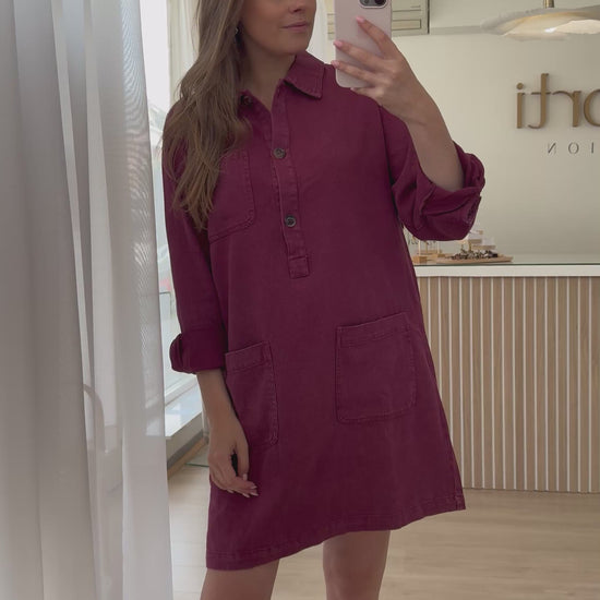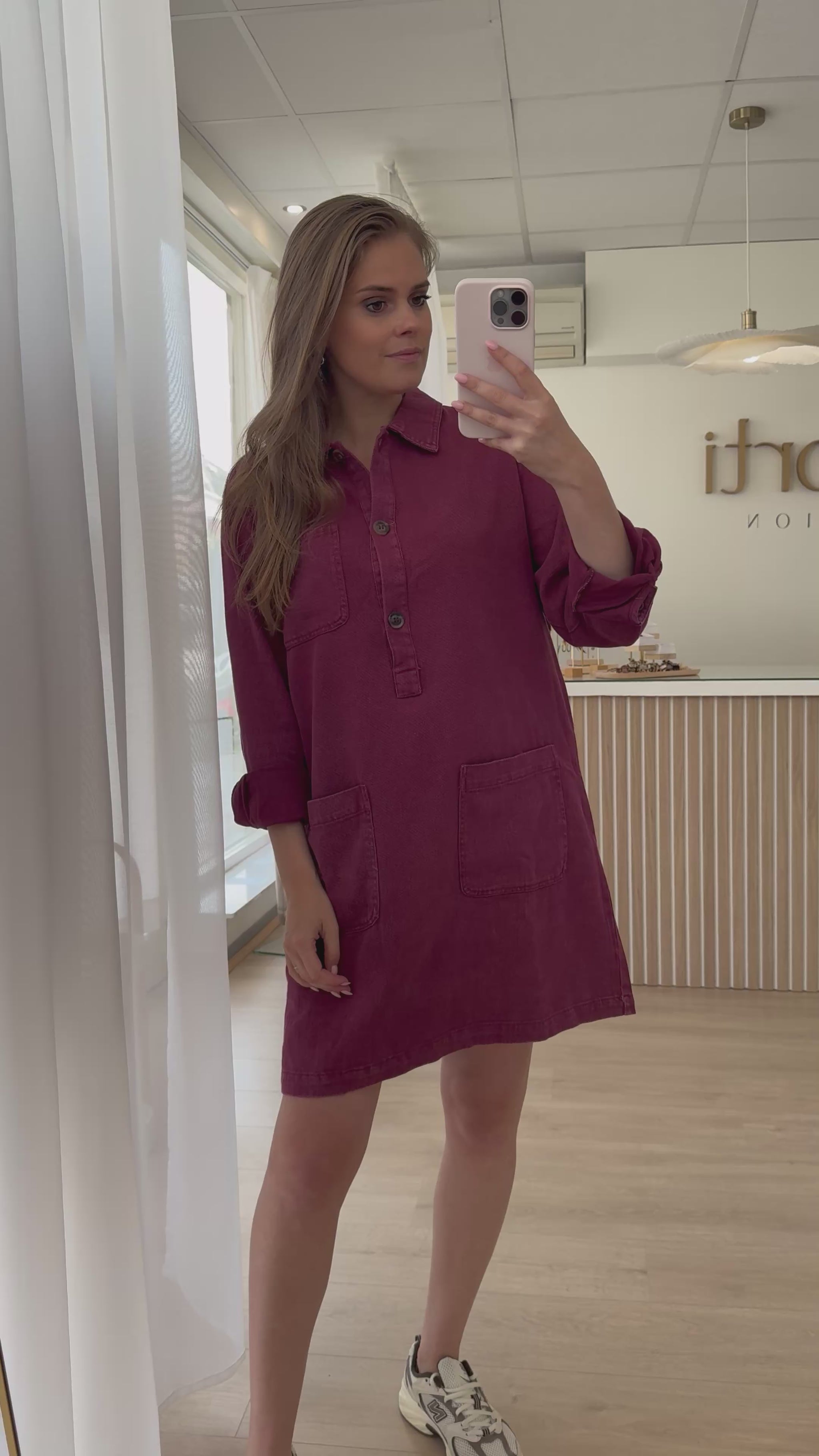 Dit comfy jeanskleedje heeft een col revers en lange mouwen die je naar wens kan omslaan. Het kleedje heeft een rechte fit en is afgewerkt met een borstzakje en 2 zakjes ter hoogte van de heupen.
