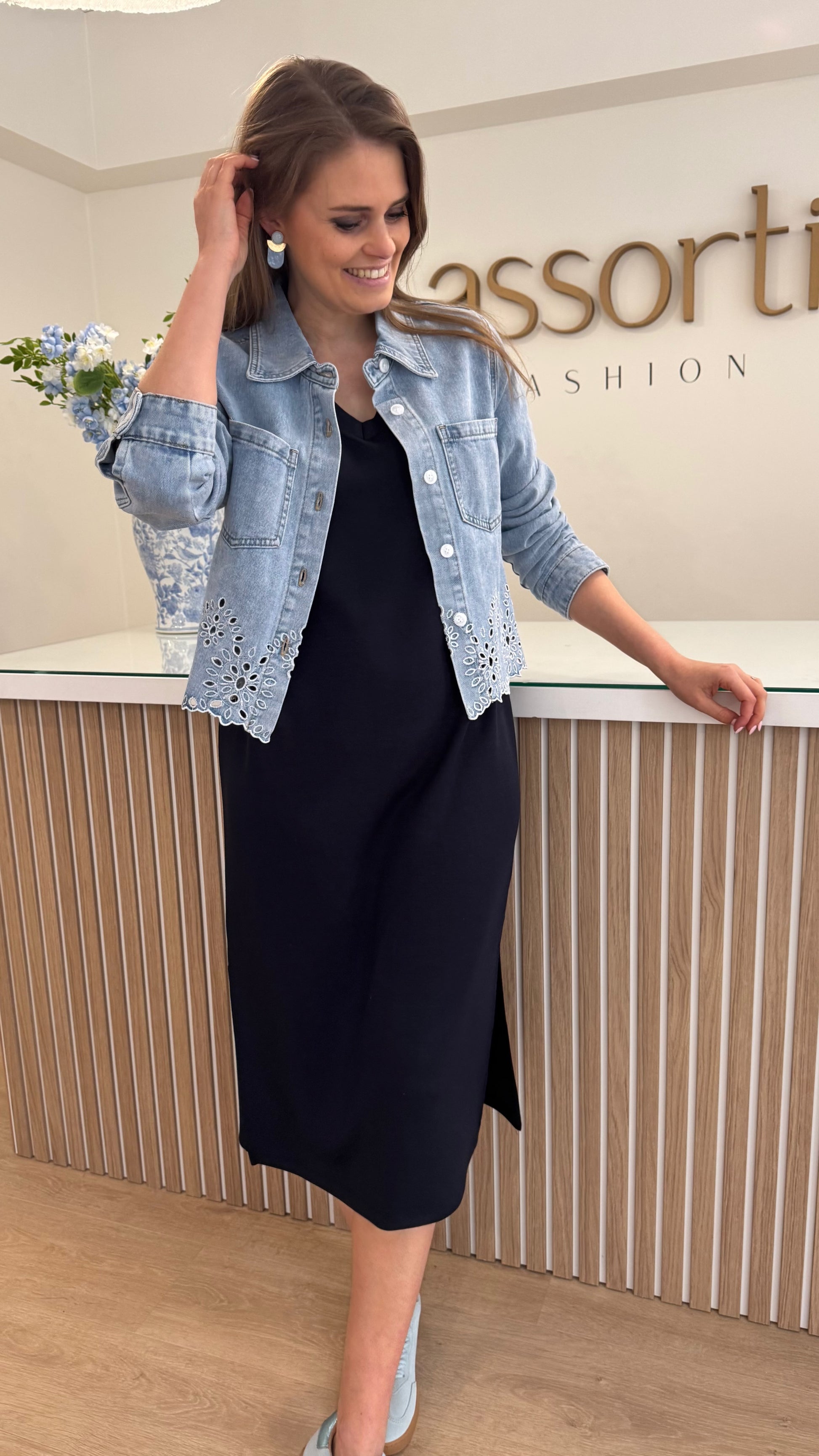 Stijlvol denim jasje met een vrouwelijke touch. Het klassieke model wordt afgewerkt met fijne broderie details onderaan voor een speels en elegant effect. Perfect om je outfit net dat beetje extra te geven. 💙