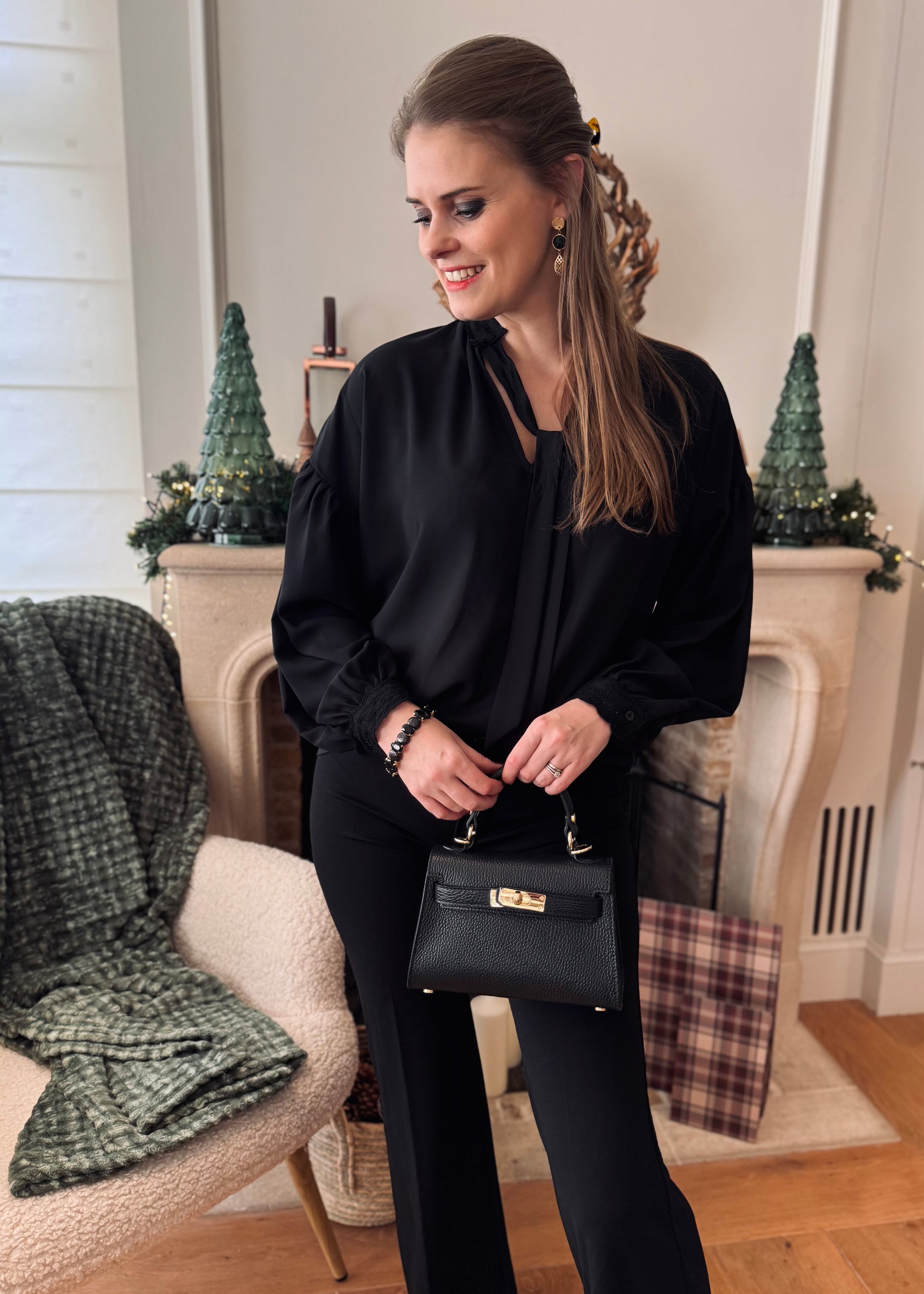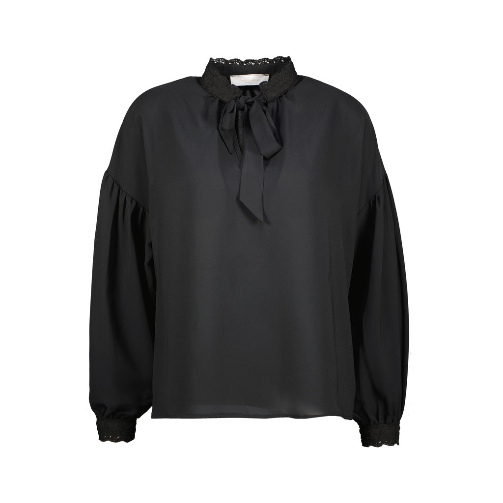 Dit bloesje heeft een ronde halslijn met een lintdetail. Het bloesje heeft een broderie detail aan de halslijn en uiteinde van de mouwen. Het bloesje heeft een losse fit.