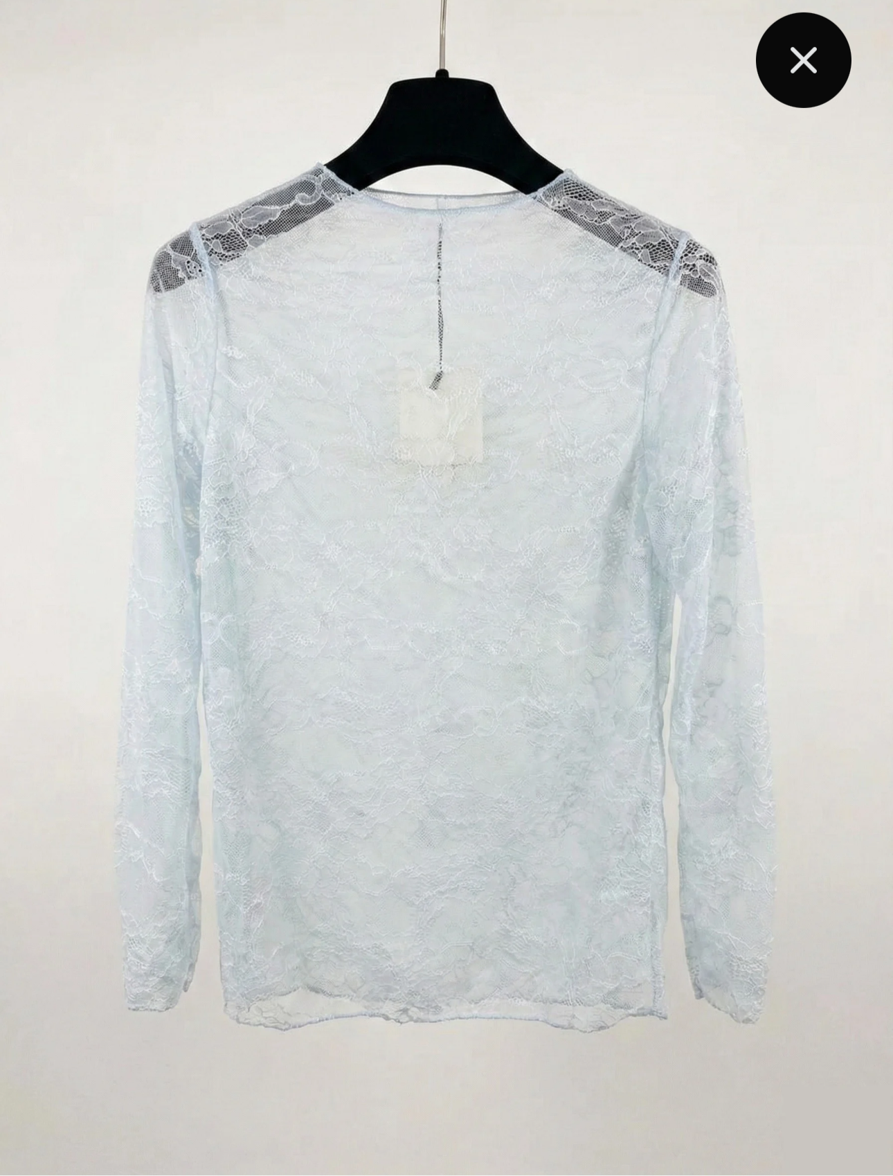 Elegant lichtblauw kanten topje met een fijn bloemenpatroon. De kleine opstaande hals en lange mouwen geven een vrouwelijke, verfijnde look. Perfect om te layeren onder een blazer, gilet of jurk.