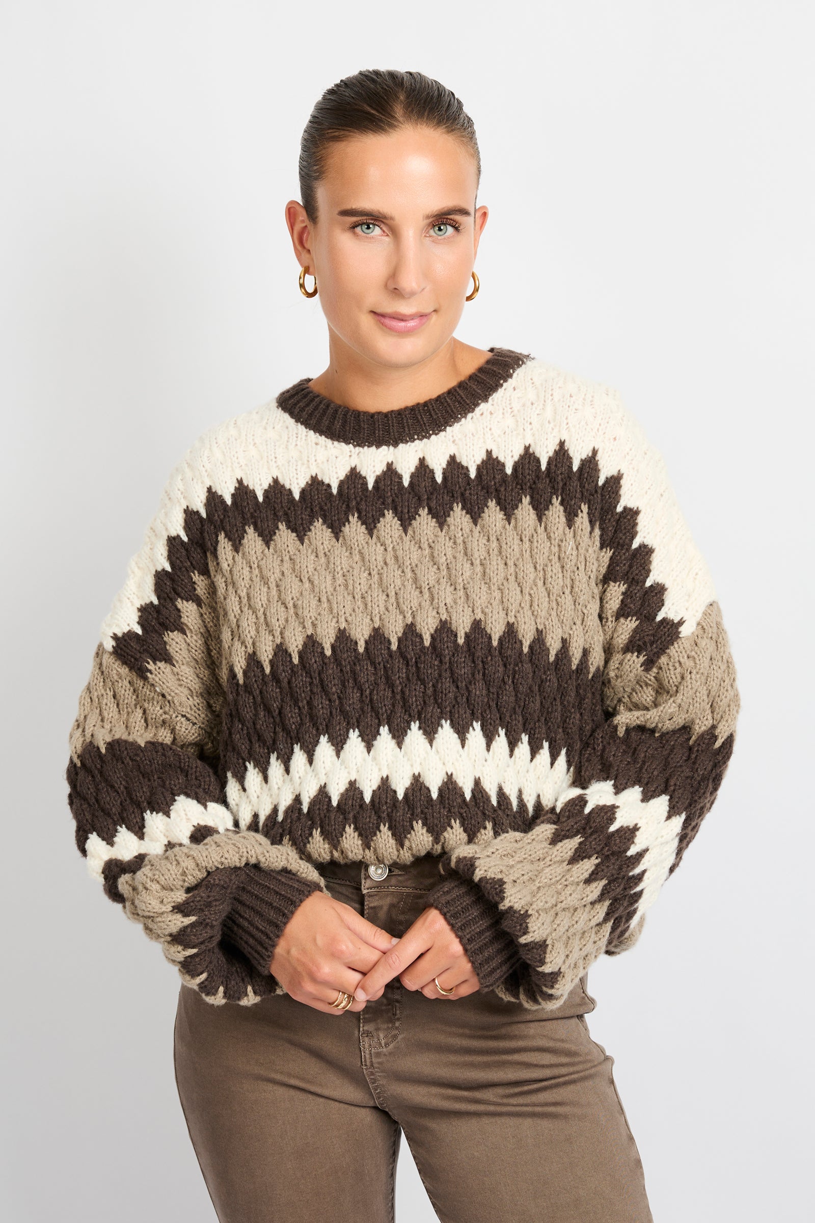De Kool trui is een echte eyecatcher met haar speelse streeppatroon en rijke structuur. Het losvallende model heeft een ronde hals en ballonmouwen die zorgen voor een eigentijdse, cozy uitstraling. De grove knit en het opvallende design maken deze trui ideaal om je outfit een boost te geven.