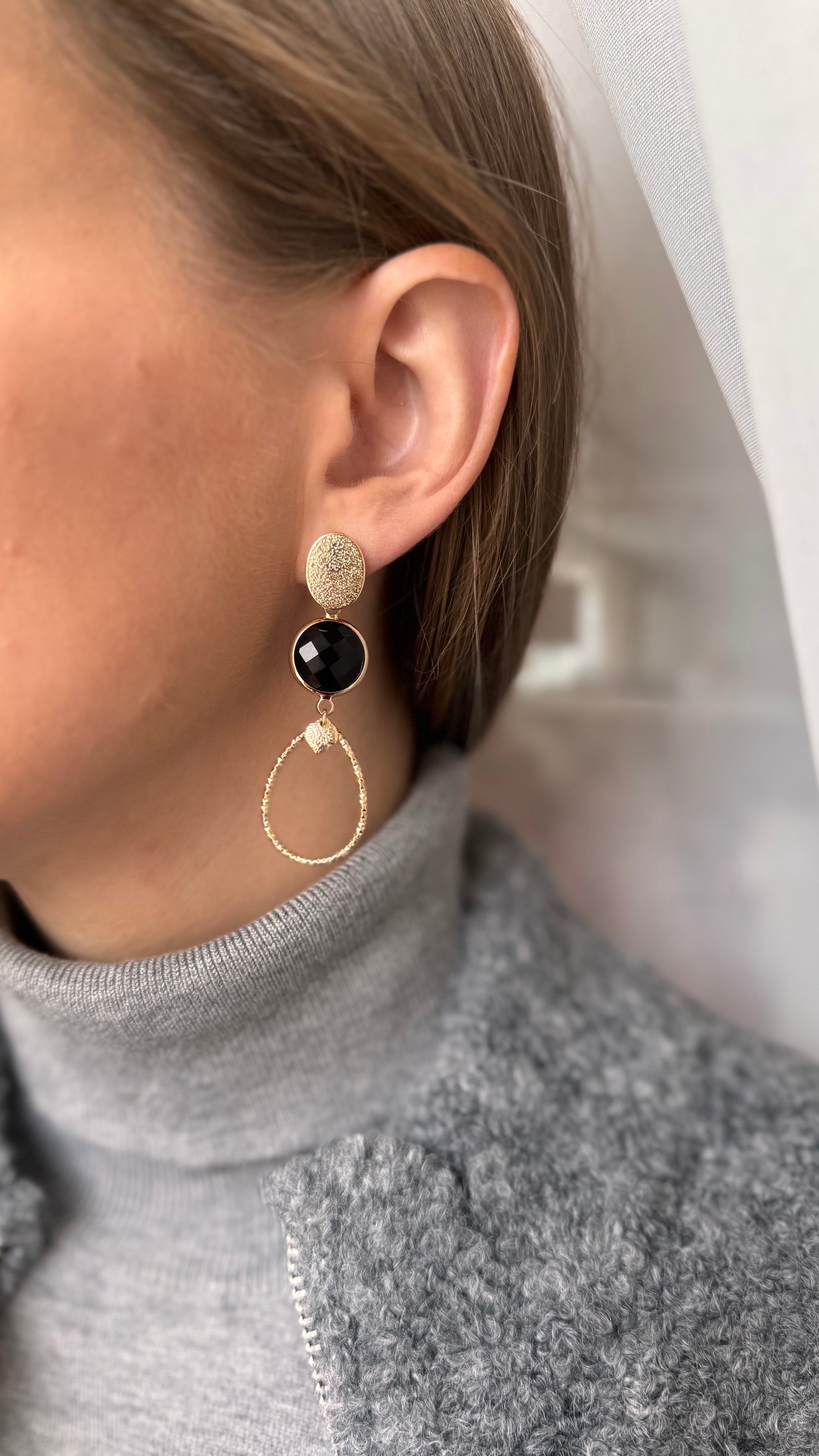 Deze Midnight Drop statement oorbellen met gouden accenten en een zwarte facetsteen. Tijdloos elegant, ideaal om elke outfit dat tikkeltje extra te geven.