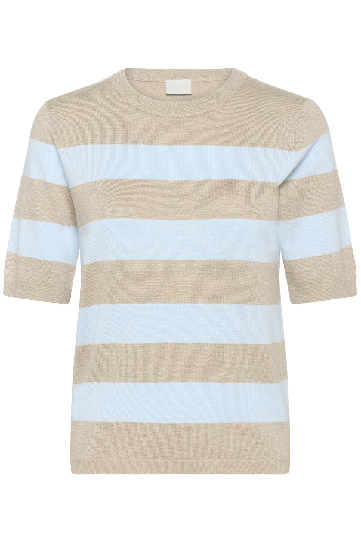 Fijngebreid truitje met korte mouwen en een ronde hals. De brede strepen in beige en lichtblauw geven een frisse, vrouwelijke uitstraling. Zacht en comfortabel, ideaal om zowel casual als iets gekleder te combineren.