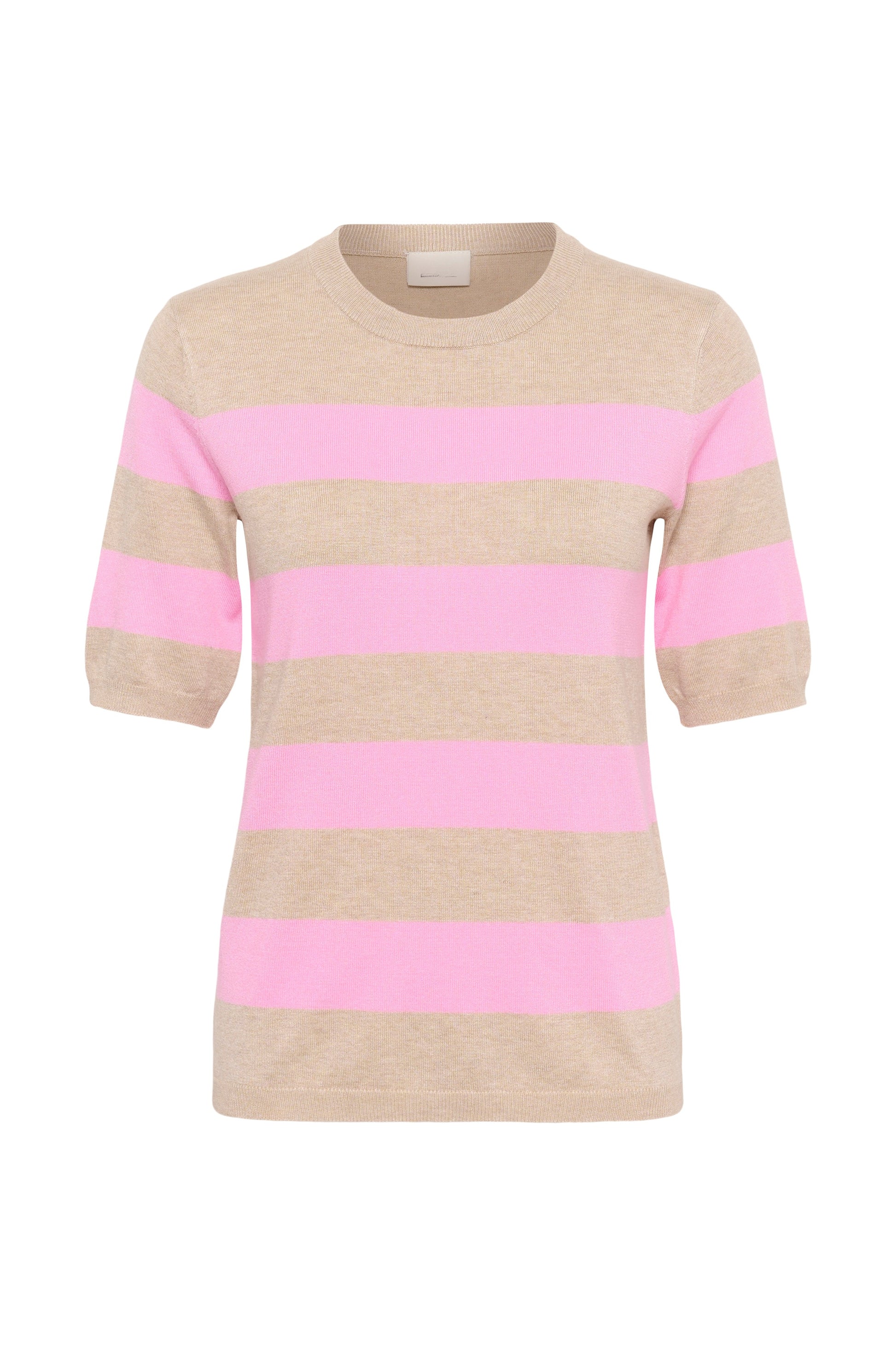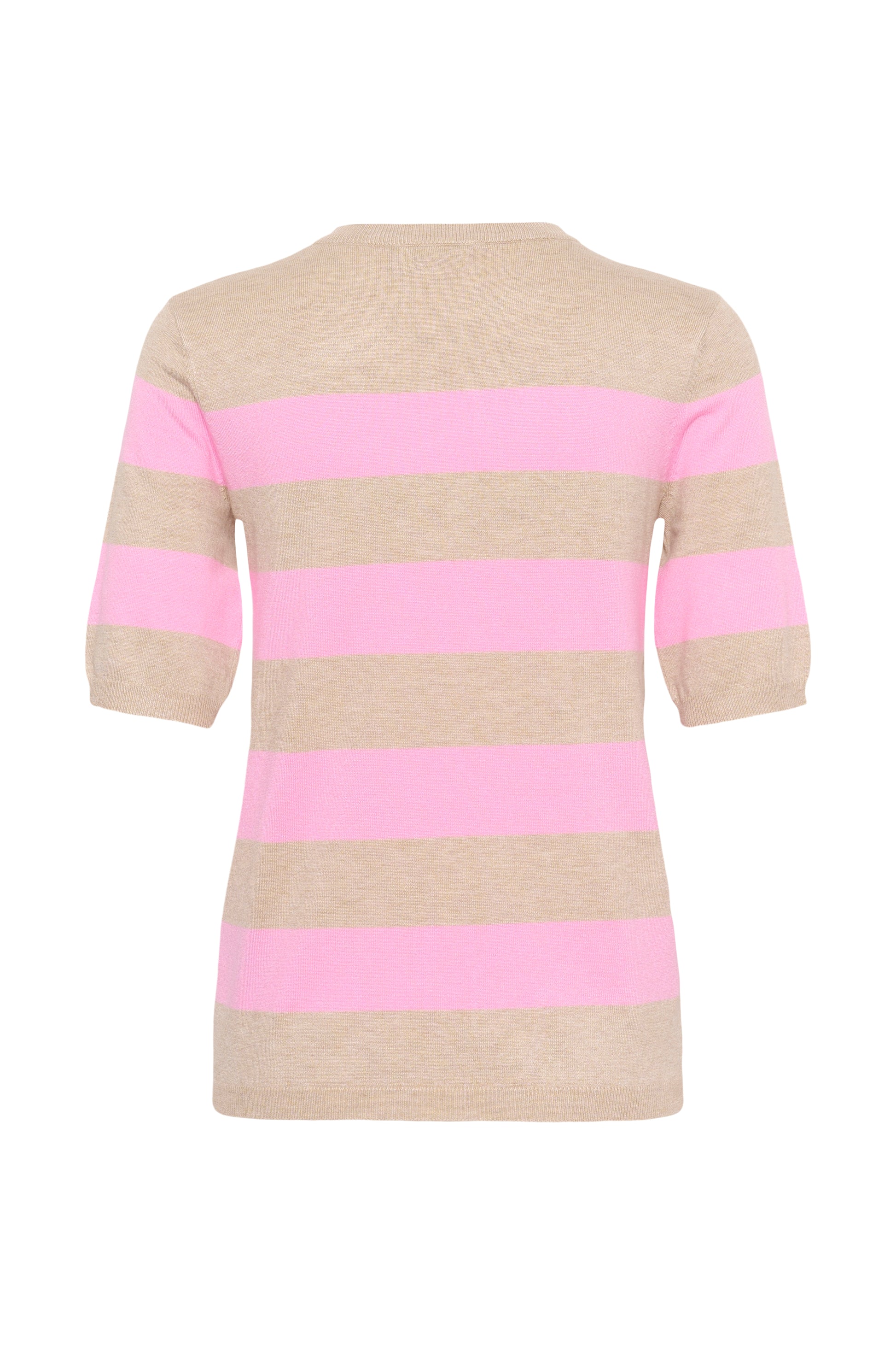 Fijngebreid truitje met korte mouwen en een ronde hals. De brede strepen in beige en roze geven een frisse, vrouwelijke uitstraling. Zacht en comfortabel, ideaal om zowel casual als iets gekleder te combineren.