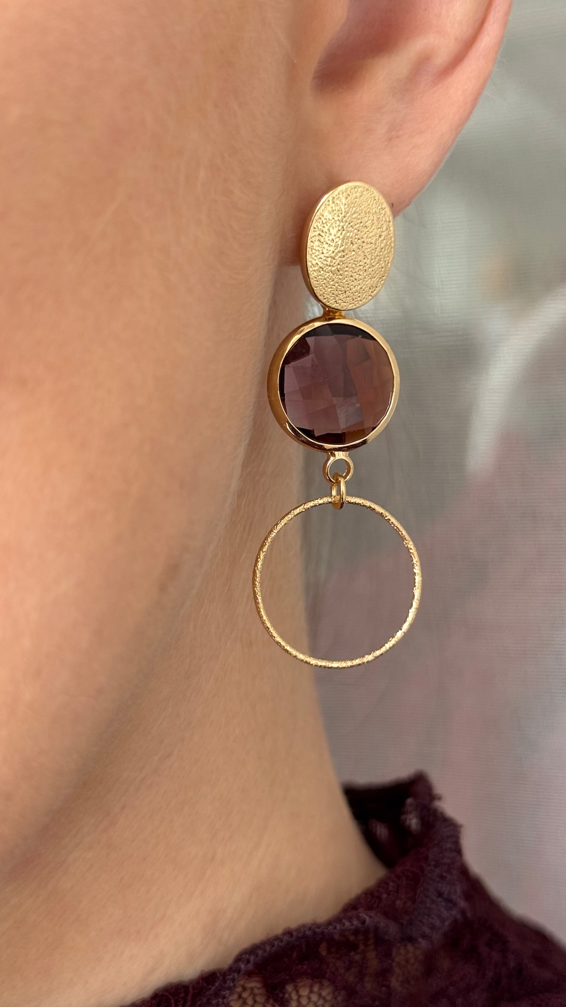 De Luna Glow is een chique statement oorbel in goudkleur met drie verfijnde elementen: een matte ovale knop, een bordeaux-kleurige facetsteen en een elegante open cirkel. Tijdloos en toch speels – perfect om elke outfit een stijlvolle finishing touch te geven. ✨