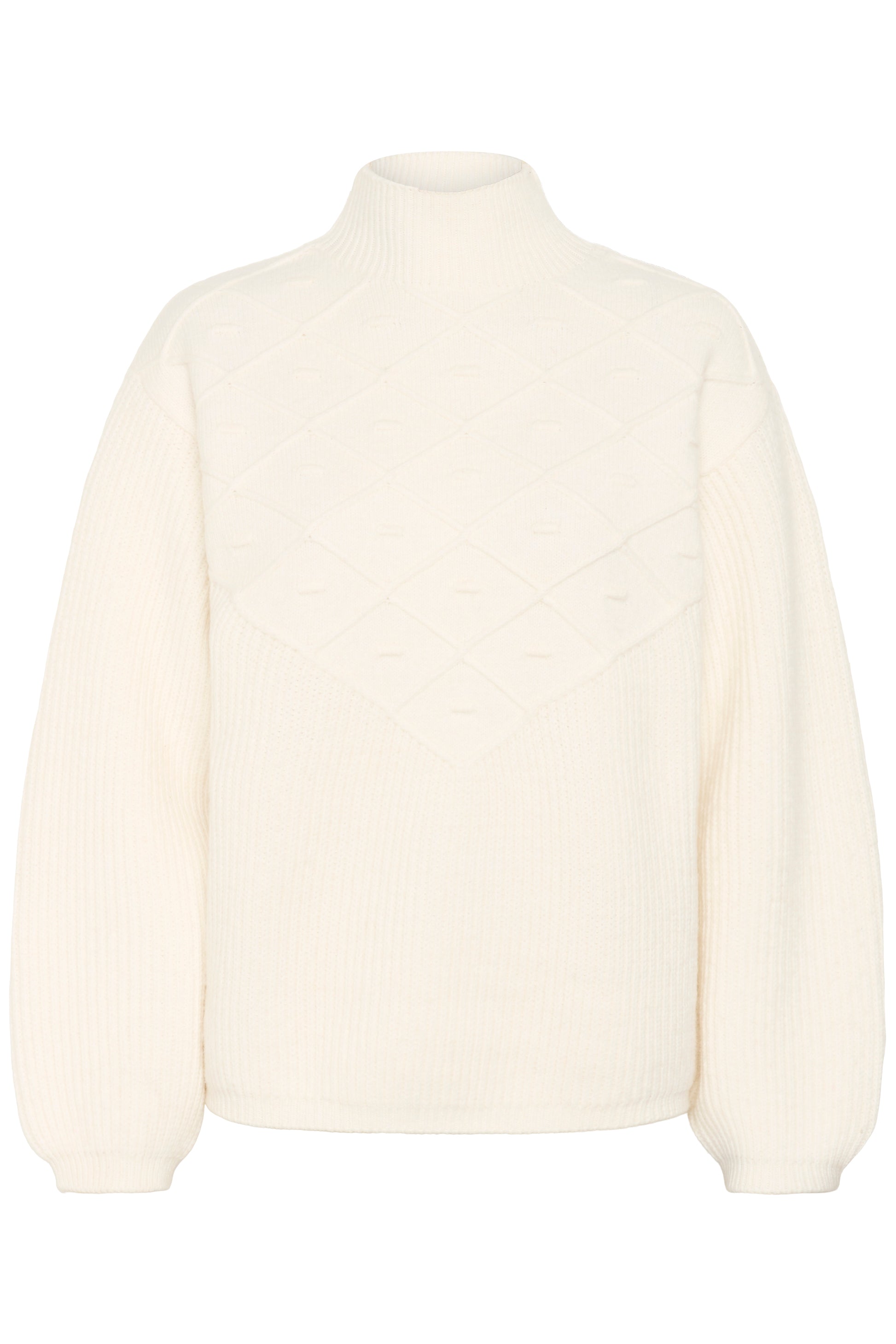 Deze trui heeft een opstaand kraagje en lange plofmouwen. De trui heeft een losse fit en is afgewerkt met prachtig breiwerk vooraan. Een echte eye-catcher!