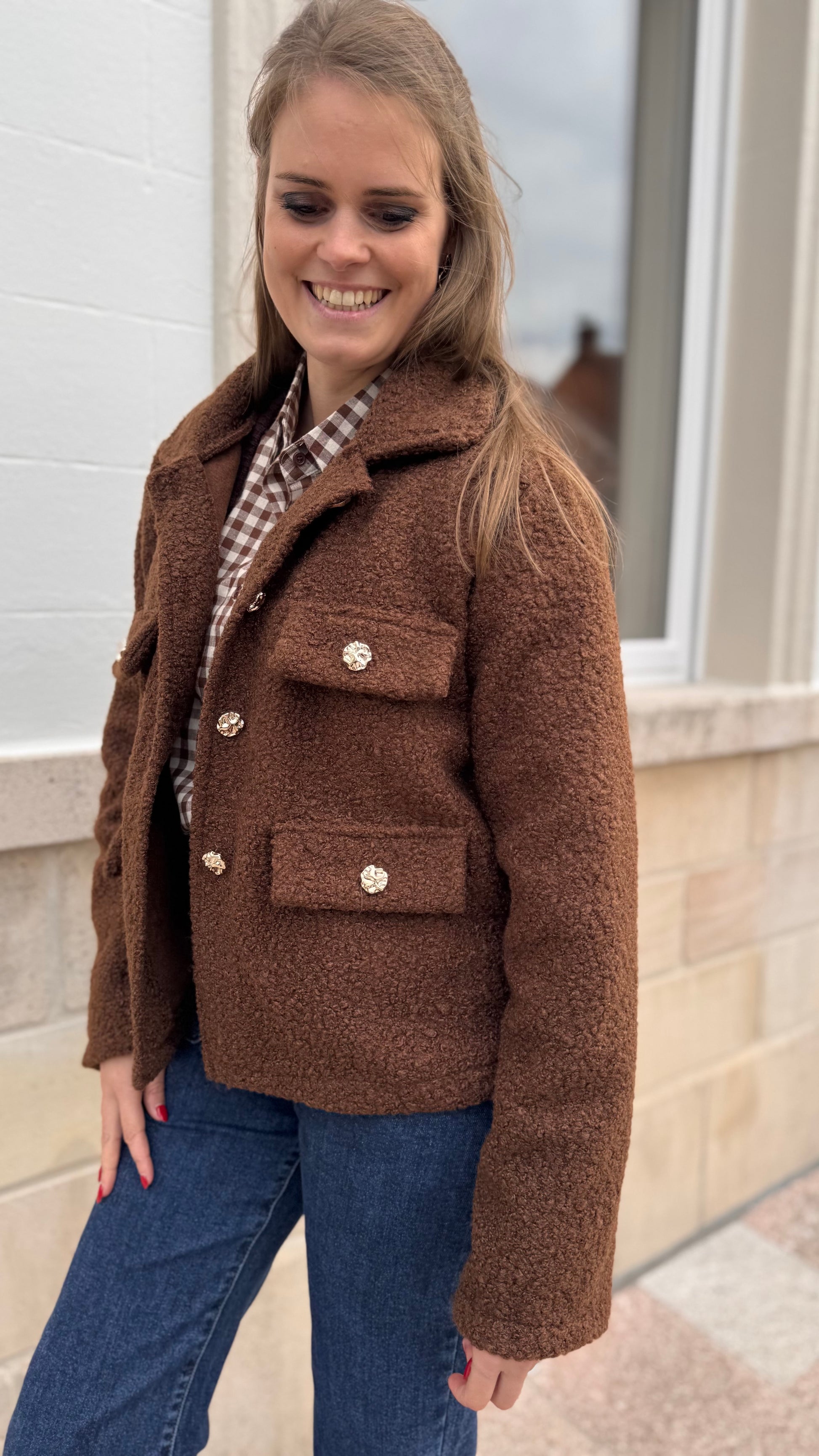 Chic jasje in warme bruintint met speelse fantasiezakjes en luxueuze gouden knopen. Perfect om zowel casual als gekleed te dragen.