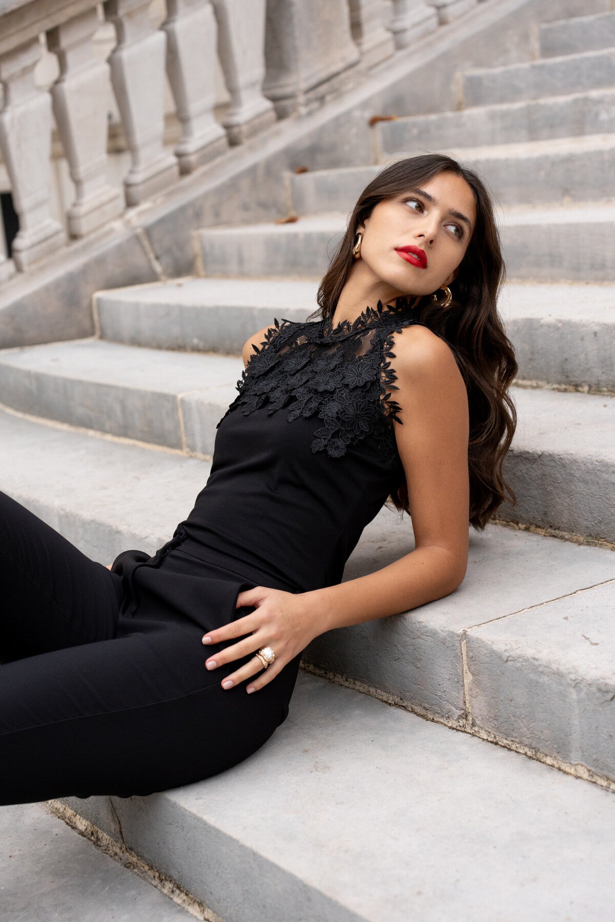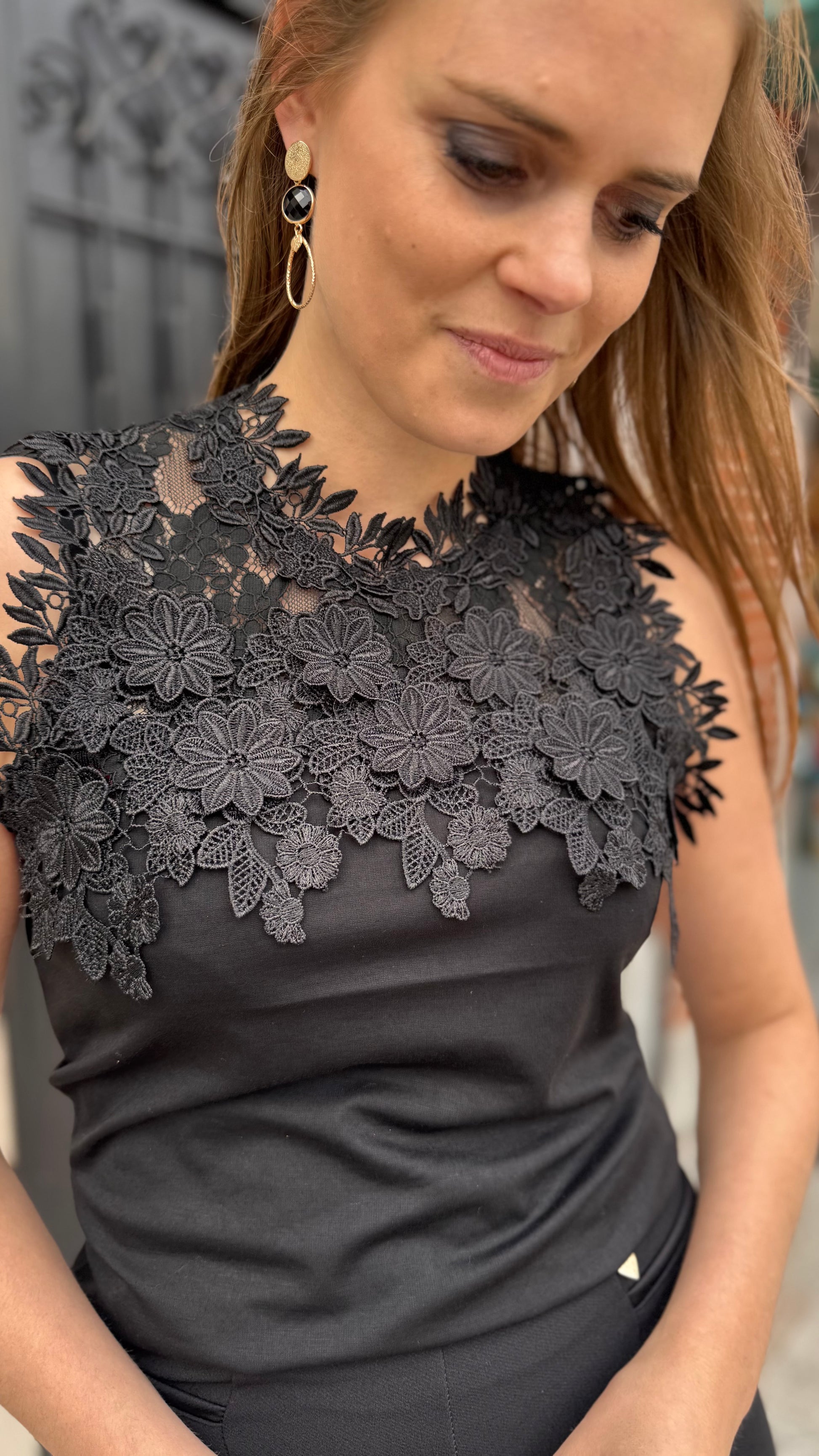 Verfijnd topje met nauwsluitende fit en luxueuze broderie afwerking. De delicate kant geeft dit item een romantische en elegante uitstraling.